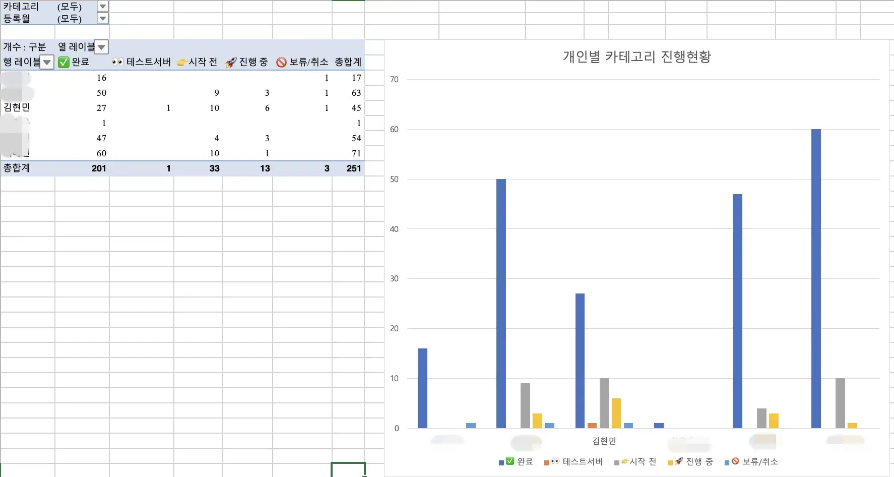 이후 팀장님은 매달 초 각자 진행한 업무들의 개수를 격려의 말씀과 함께 엑셀 파일로 전달해 주셨습니다.